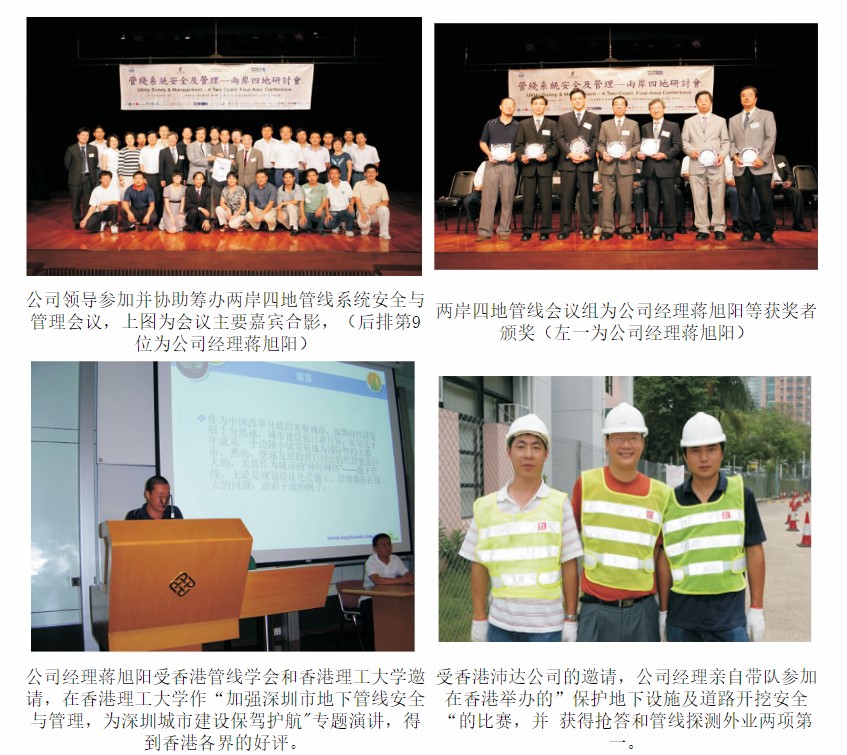 我公司加强了与香港管线学会、沛达工程顾问有限公司、香港工程網絡資料管理中心有限公司、中国专业管线学会、香港理工大学、深圳勘察设计协会、深圳各勘察设计公司的交流与学习,从他们身上学到了许多先进的技术和管理理念,同时也把我们公司的好的工作心得体会拿出来与他们进行交流,共同提高技术经验和管理水平。 我公司因良好的声誉,得到了目前国内管线探测最权威机构中国城市规划协会地下管线专业 委员会的认可, 并成为深圳市第四家该委员会会员单位,同时也得到了香港理工大学协办的香港管线测量师学会的认可,并任命我公司总经理蒋旭阳同志为香港管线测量师学会深圳分会会长职 务,推动深港两地 管线探测技术交流与合作 。
